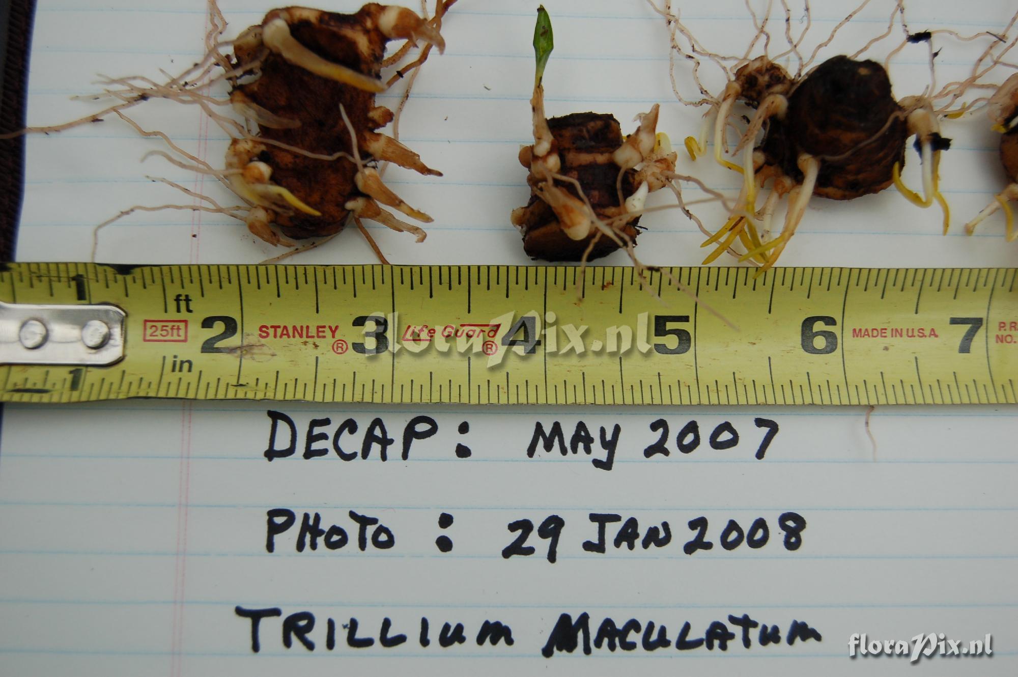 1971 - Woodland (Garden) - 2008-01-30(Dimension: 2030 x 1380 pixels - Counter: 4994) Trillium maculatum offsets ![]() Photographer: Harold Holmes Note: Trillium Maculatum rhizomes were decapitated in May 2007. Rhizome on left was sliced long ways after being decapitated. rhizome on the right was smaller and was not sliced long ways after decapitation. Both had a significant number (11-12)of offsets in 9 months.
