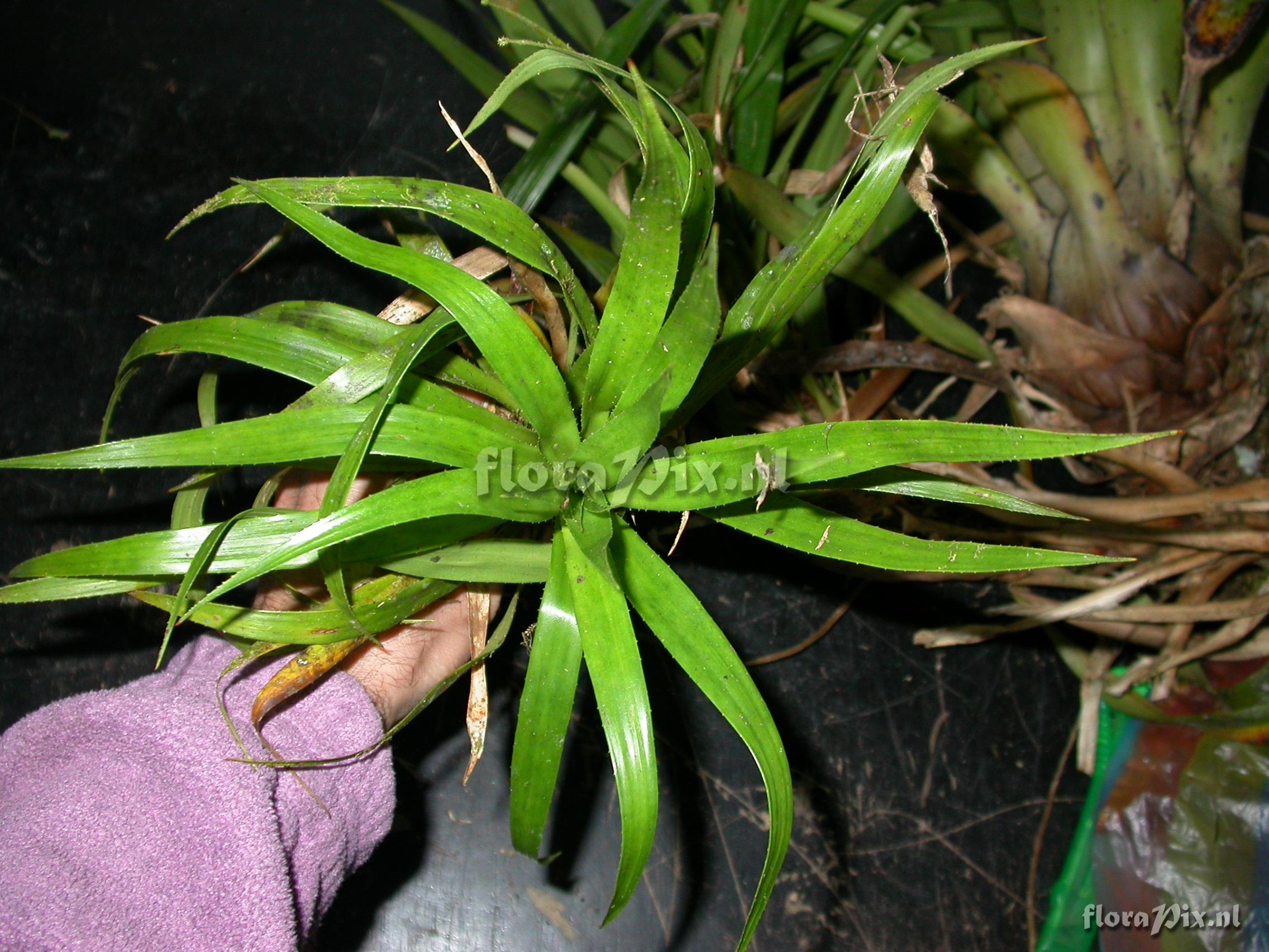 Verzamel locatie: Ecuador - Zamora-Chinchipe Province; few km east of Pass (""El Tiro"") between Loja and Zamora; moist lower slope forest Fotograaf: Florian Werner Opmerking: Col.: Werner, F.A. 2136 (09-12-2006) "leaves 25-30cm long, base chestnut-brown on both sides, shoot ca. 1cm diameter; considerably smaller than any other local Greigia; single leaves from mat. plant."