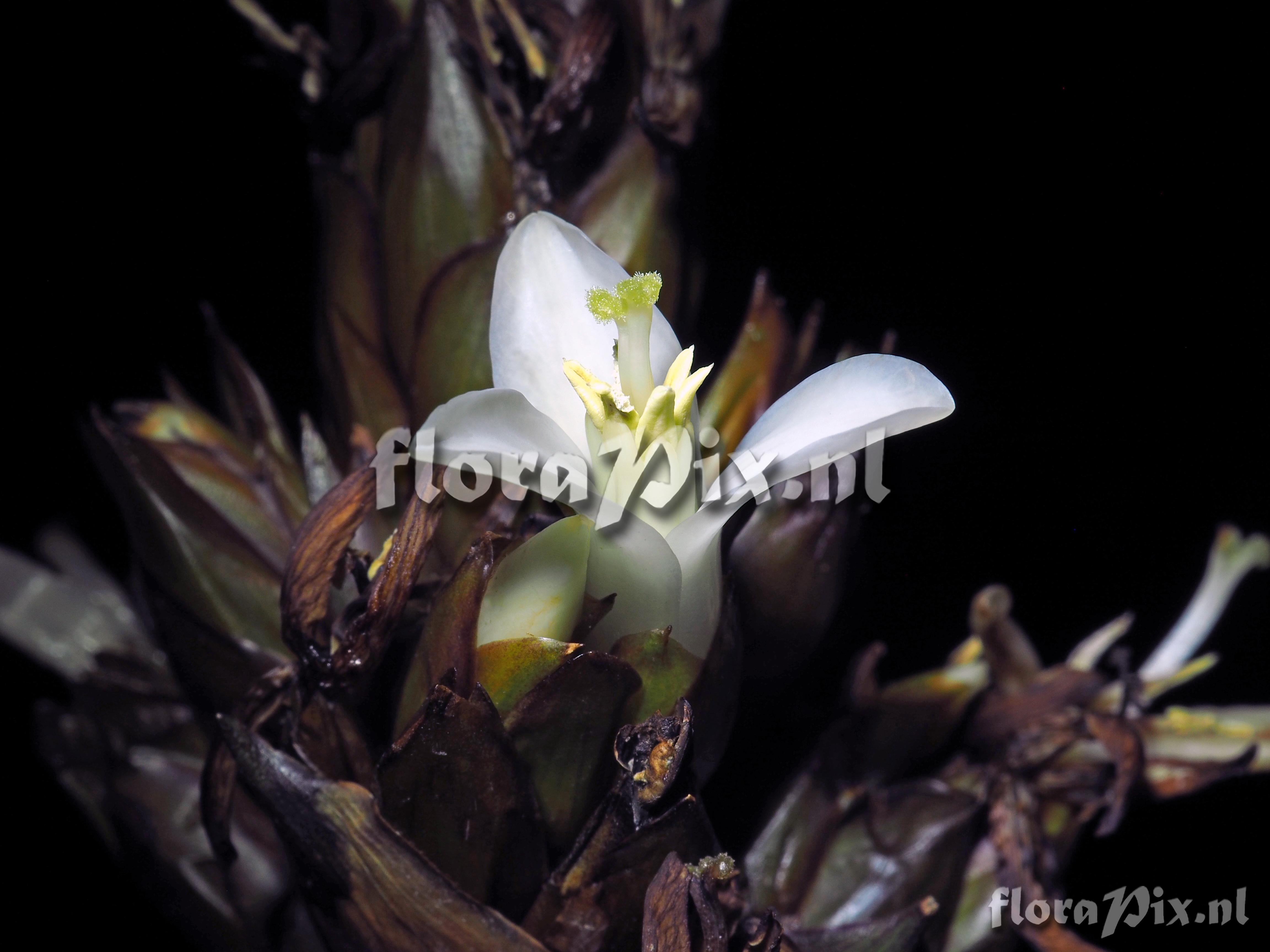 Verzamel locatie: Ecuador - Morona Santiago - 7 km on road Macas to Cuenca from E45 at 2371 m Fotograaf: Jerry Raack Opmerking: This is a NIGHT FLOWERING bromeliad; hence, the flowers do not fully open until about an hour after dark, and close up before daylight. The flowers have a slight fragrance when open. Probably pollinated by moths or night-flying insects of some type. Grows in very wet conditions in deep moss as a terrestrial or epiphyte low on the trees near the forest floor.