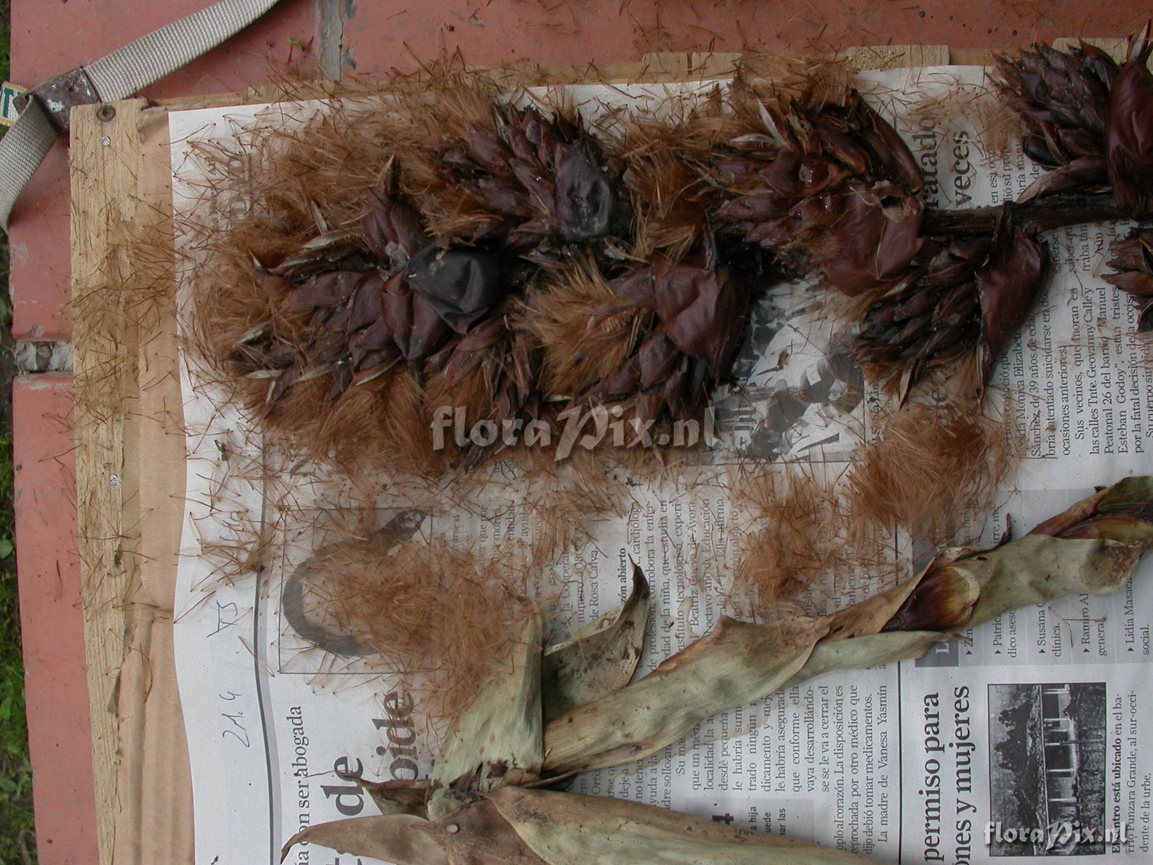 Verzamel locatie: Ecuador - Prov. of Zamora-Chinchipe, area of Estación Cientifica San Francisco (S 03°58“, W 79°04“ ), road Loja-Zamora, ca. 35 km from Loja; moist montane forest Fotograaf: Florian Werner Opmerking: Col.: Werner, F.A. 3058 (20-04-2010) inf. erect, large, with globose bracts subduing every parial infl. Leaves with very broaf base, tapering off ver gradually (but tip rounded).