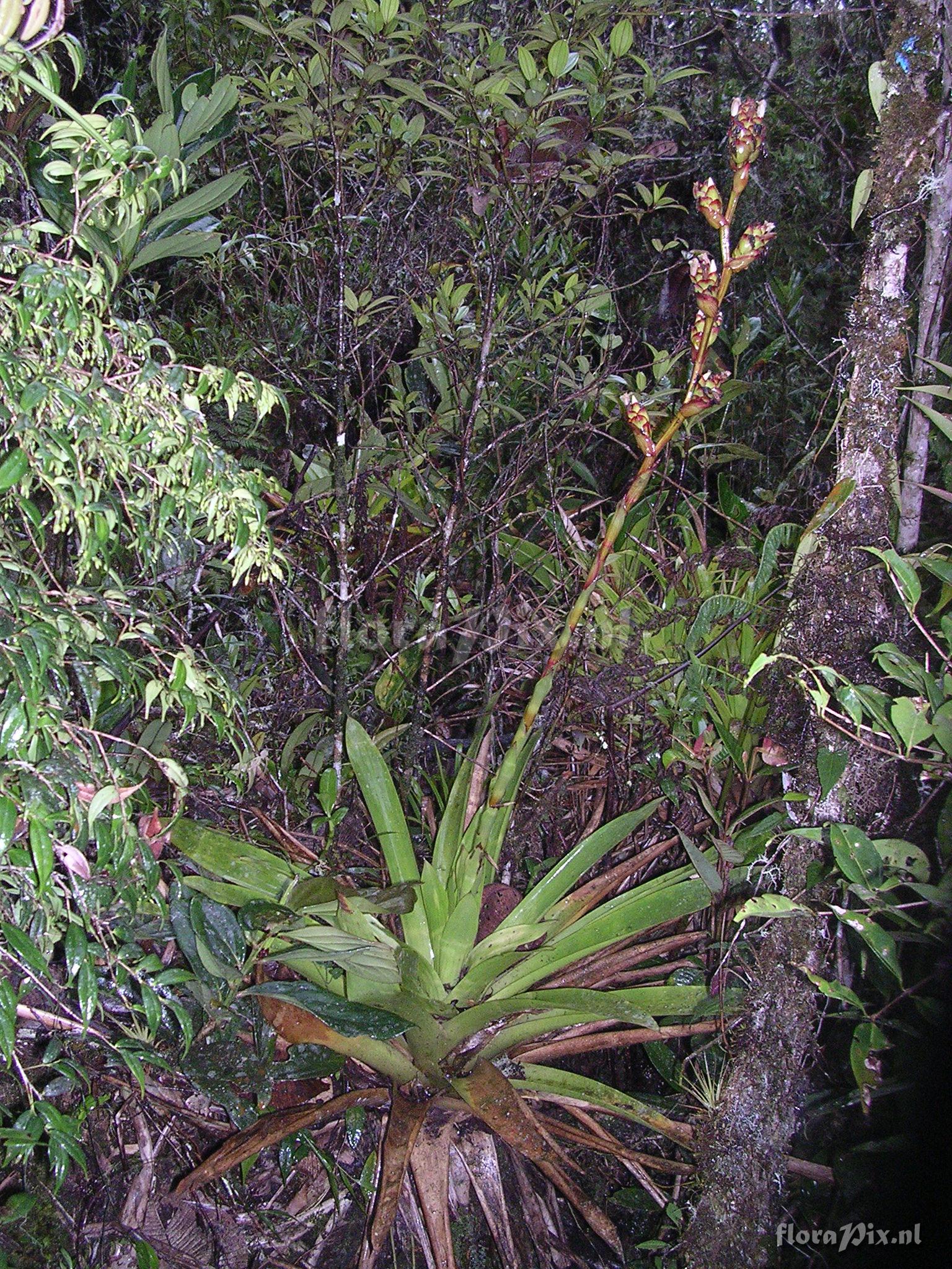 (Geladen als: Guzmania aff. cuzcoensis (sp. nov.) ) Verzamel locatie: Ecuador - Prov. of Zamora-Chinchipe, area of Estación Cientifica San Francisco (S 03°58“, W 79°04“ ), road Loja-Zamora, ca. 35 km from Loja; moist montane forest Fotograaf: Florian Werner Opmerking: Col.: Werner, F.A. 1421 (08-01-2004) - Det.: J.M. Manzanares "flowers white, flower bracts yellowish green with bright red margins; bracts subtending flower headsrather light brown and with red longitudinal striping plus red margins" Determinatie: Opgelost
