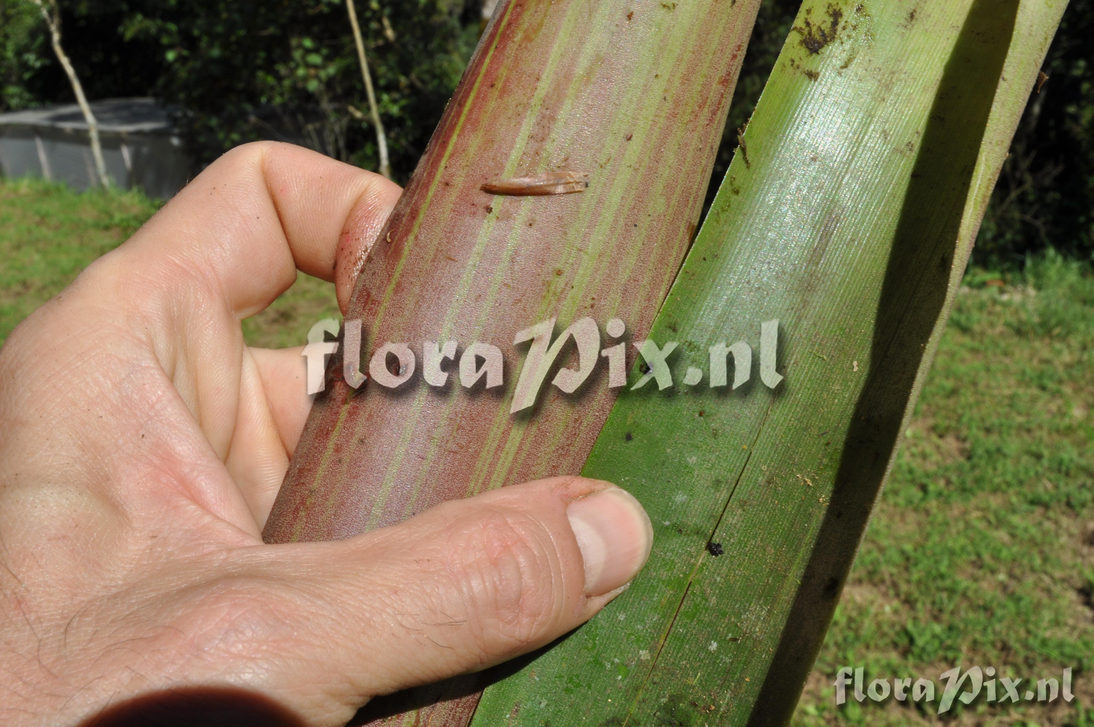 (Geladen als: Guzmania ) Verzamel locatie: Ecuador - Prov. Zamora-Chinchipe; close to Zamora; entrance of Podocarpus NP ""Bombuscaro"", tall premontane moist forest Fotograaf: Florian Werner Opmerking: Col.: Werner, F.A. 3122 (08-04-2011) else often terrestrial in thick raw humus. Rather compact species that grows up into the midstorey. Unmistakable intense red leaf striping even in mature plants. Juveniles in their compactness resembling rather a Tillandsia. Flower-advertising bracts red or, in center, yellow. Determinatie: Opgelost