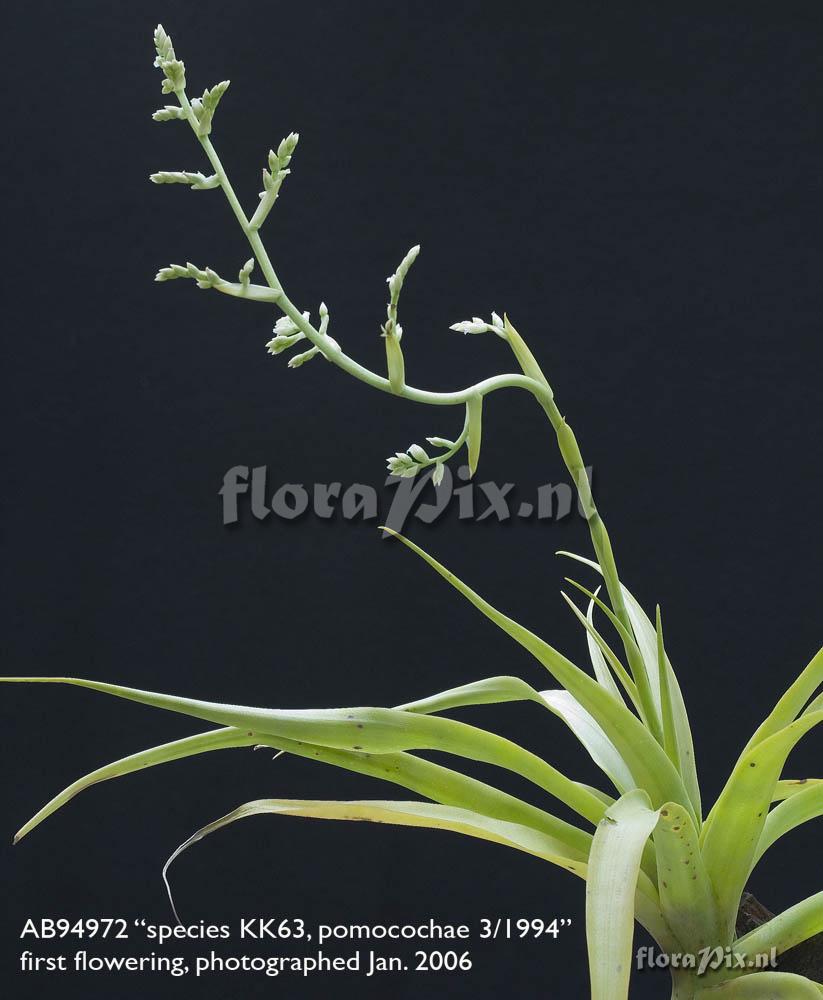 Opmerking: grown from seed ex Karel Knize, Peru, 1994. Flowering plant 40 cm. leaves 25 cm. Grown epiphytically.