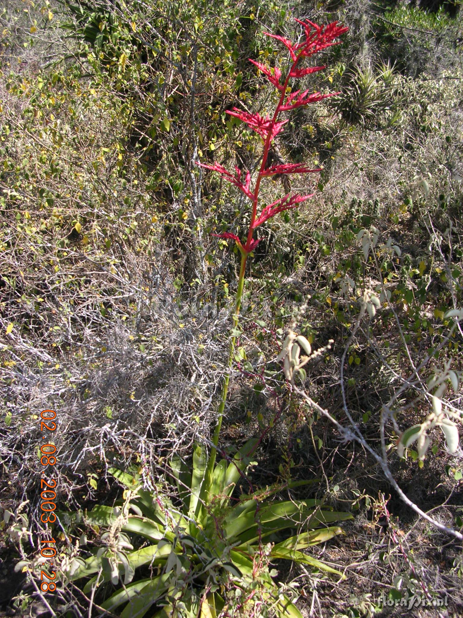 Verzamel locatie: Ecuador - Province of Pichincha, Bosque Protector Jerusalén, close to Guayllabamba (S 00° 00', W 078° 21'); interandean dry forest (550 mm prec./an.) monodominated by Acacia macracantha. Fotograaf: Florian Werner Opmerking: Col.: Werner, F.A. 836 (02-03-2004) - Det.: W. Till (U Vienna) common, the only wide-tanked bromeliad in the area, inflorescence bright red, leaves often bright yellow.