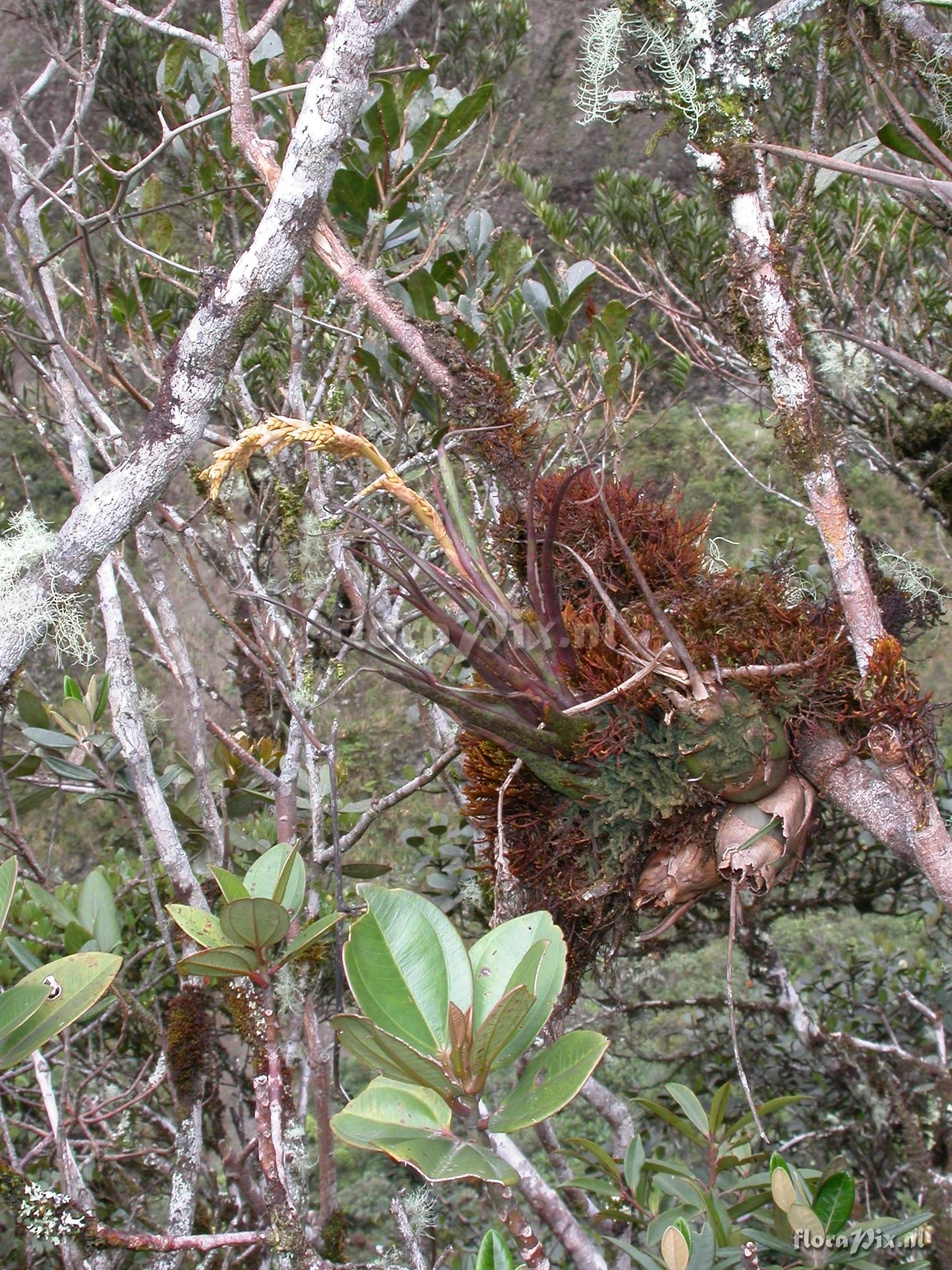 Verzamel locatie: Ecuador - Zamora-Chinchipe Province; few km east of Pass (""El Tiro"") between Loja and Zamora; very open, windswept and stunted ridge forest. Fotograaf: Florian Werner Opmerking: Col.: Werner, F.A. 2216 (27-04-2007) - Det.: H. Luther (SEL) 2008 "growing upright; leaf tips touch infl. (i.e., conical gestalt). Ja genau, alles Gute zum Geburtstag!"