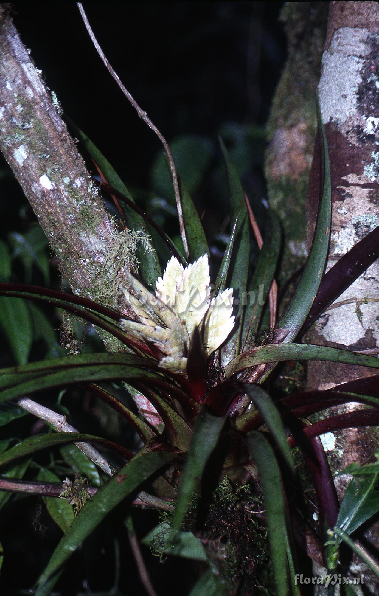Verzamel locatie: Ecuador - Loja - Approximately 38 km south of Yangana in Loja province of Ecuador. Original collection in 1990 with Jeffery Kent. Subsequent collection in April 1997 with Jose Manzanares. Fotograaf: Jerry Raack Opmerking: I'm providing these photos of Tillandsia raackii in the wild taken in 1997 so everyone can see the habitat, growth size and differences in specimens seen at the site. In cultivation for me, it fails to obtain the vivid red coloration seen on the specimens I have shown here. Pitcairnia alata grows in the same area. The elevation was approximately 6000 ft. The largest speciman seen had 9 spikes on the inflorescence. Flowers do not fully open, but stay closed. We say hummingbirds visiting these plants. (Verzonden: brom-l@science.uu.nl)