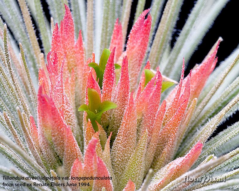 Verzamel locatie: New Zealand - Jalisco - Mazamitla at 2,000m. Fotograaf: Andrew Flower Opmerking: Grown from seed ex Renate Ehlers labelled "intermediate between T. atriviridipetala and T. plumosa (scape 1-2cm. long) EM941402". Seed sown 1994 and seed parent subsequently published 2009 as Tillandsia atroviridipetala var. longepedunculata var. nov., paratype K & R Ehlers EM941402.. (Verzonden: species@bsi.org)