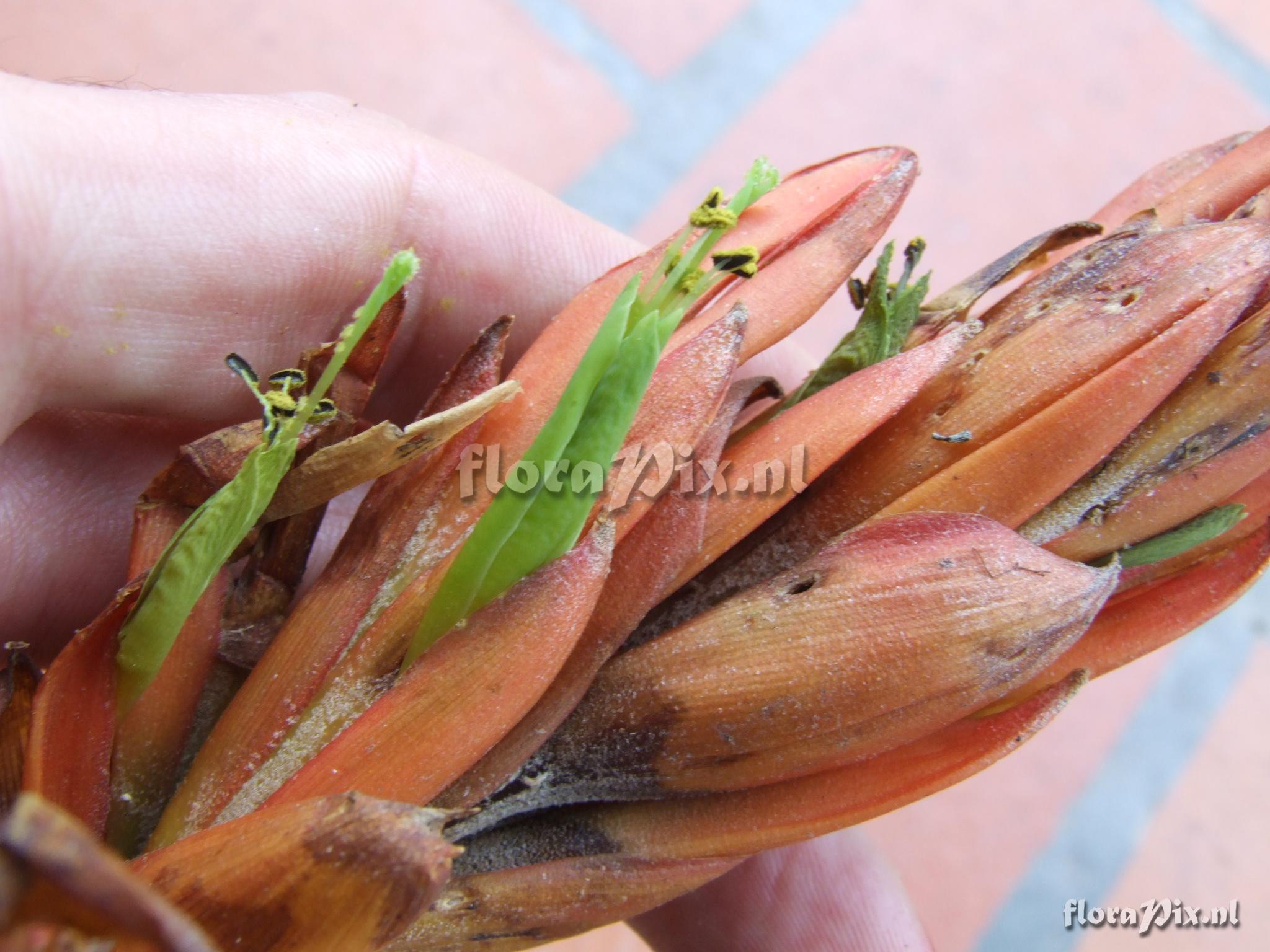 Verzamel locatie: Ecuador - Prov. of Zamora-Chinchipe, area of Estación Cientifica San Francisco (S 03°58“, W 79°04“ ), road Loja-Zamora, ca. 35 km from Loja; moist montane forest Fotograaf: Florian Werner Opmerking: Col.: Werner, F.A. 1962 (23-04-2006) - Det.: H. Luther (SEL) 2007 "greyish type; infl. pending: bracts bright light orange, petals apple-green. Leaves full of trichomes which adaxially in the basal (""tank"")-half are hairy and brown.; strong fibres in leaves."