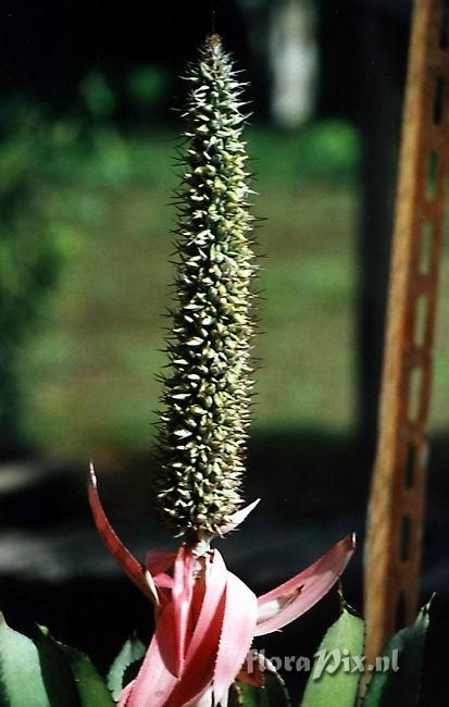 - Add Note (5392): Steven Heathcote (2010-01-22) - Peter, it seems A setigera has a pendulous inflorescence (illustrated in the Flora Neotropica and on the TROPICOS website) whereas A longicuspis infl is erect. Other differences listed in the FN are scape bracts (setigera = bright red, longicuspis = rose) and the plant size (setigera = 1 to 3m, longicuspis = 0.6m). Based on this I think the plant is more likely to be A longicuspis.