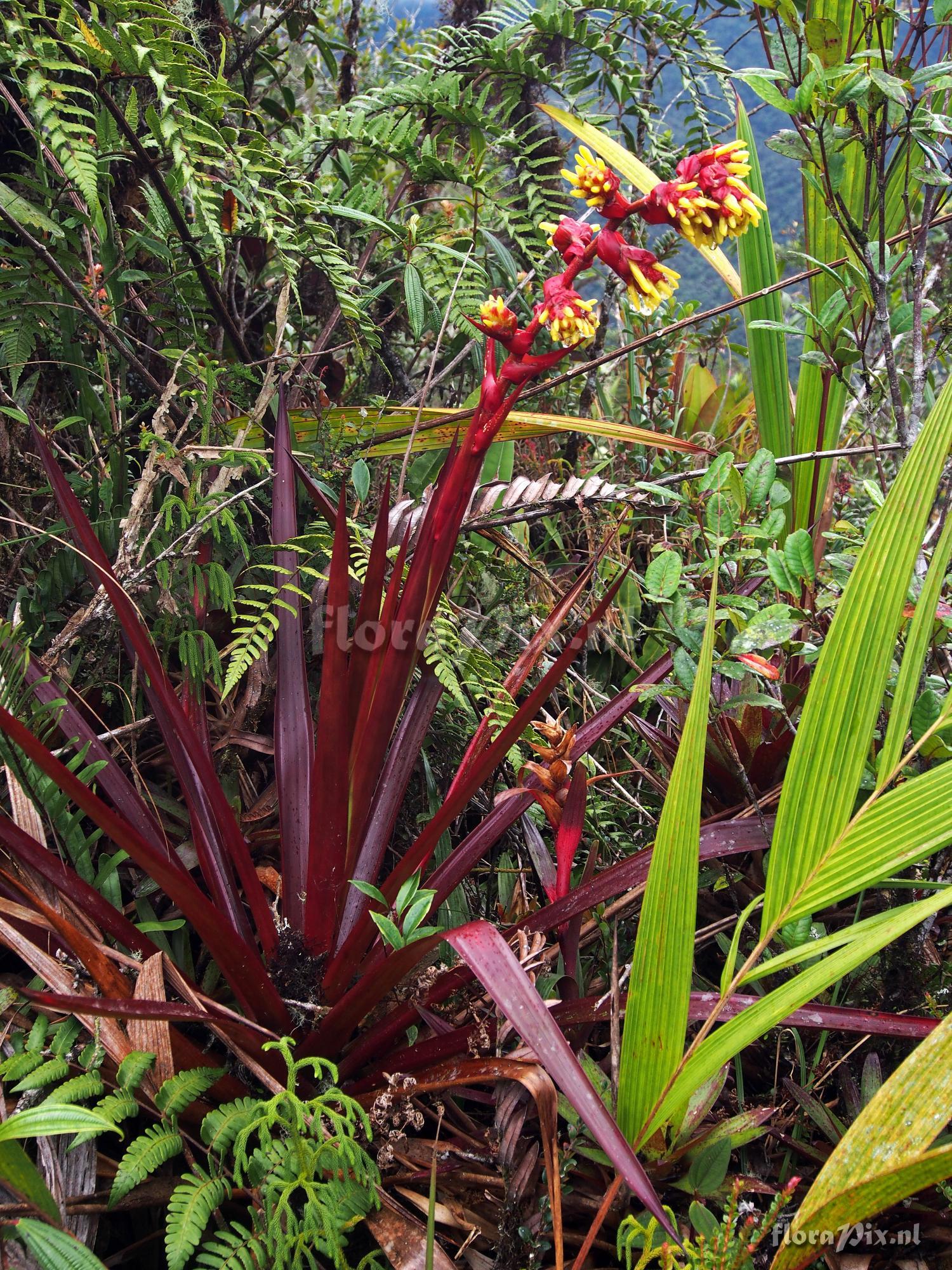 Locality: Ecuador, Zamora-Chinchipe Province - 1st 3 pictures are from site on road from Los Encuentros heading east toward the Condor Mts in Zamora-Chinchipe Province at an altitude of 1632 meters. These plants were very large - I would say they were almost 1.25 meters tall. They were in full anthesis at the time of photographing them. They were growing terrestrially along the road cuts among the ever present deep creeping fern that covers these areas. Quite spectacular. This area did not appear to be overly wet. The 2nd 2 pictures (plant with red foliages are from a plant at a different location (Limon Antenna Road in Morona-Santiago Province growing at an altitude of 2284 meters. These plants at higher altitude were not fully open, so at the time were somewhat smaller, growing to about 1 meter high. Photographer: Jerry Raack Note: Higher elevation specimen.