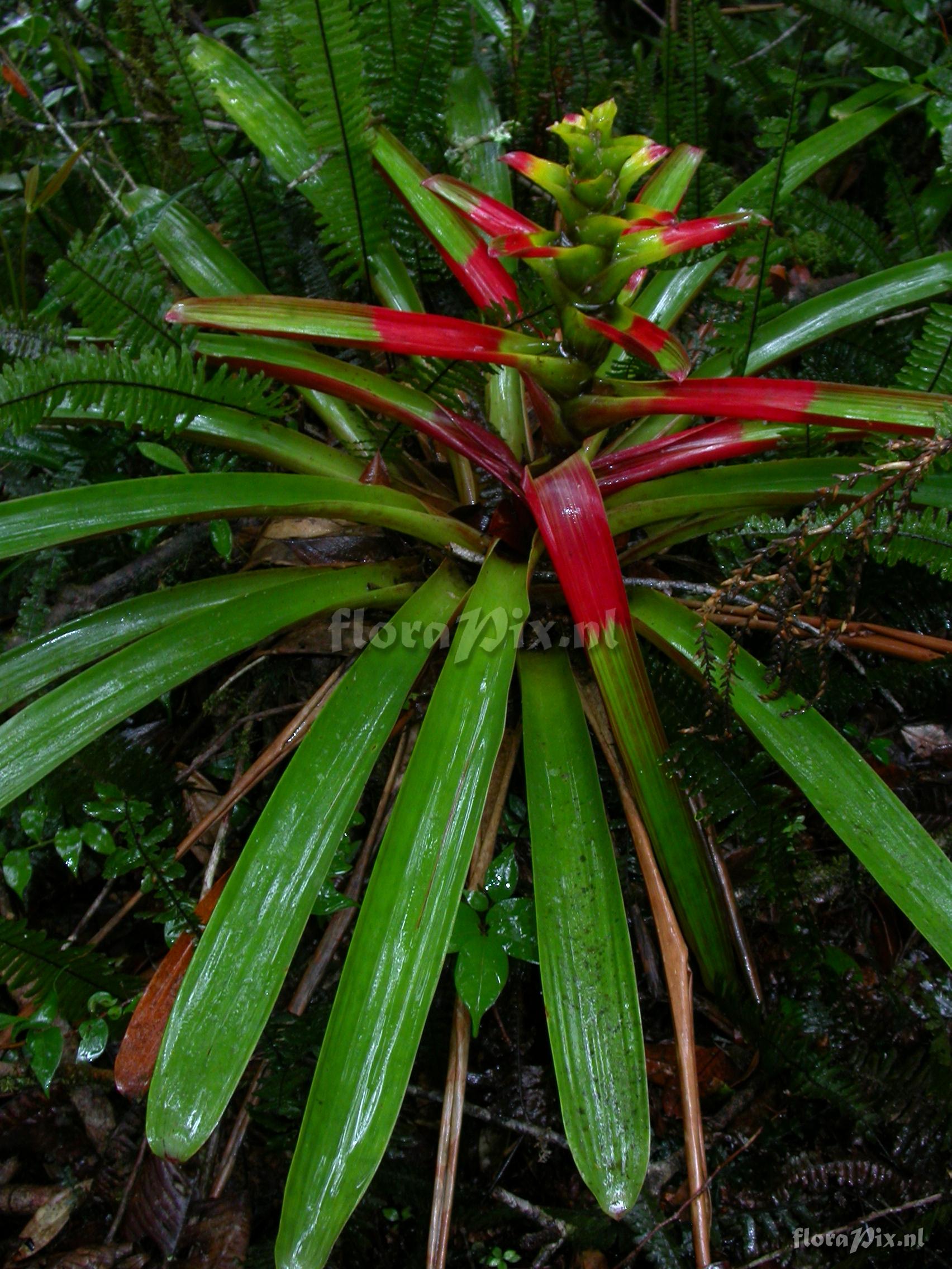 Locality: Ecuador - Prov. Zamora-Chinchipe; close to Zamora; entrance of Podocarpus NP ""Bombuscaro"", tall premontane moist forest Photographer: Florian Werner Note: Col.: Werner, F.A. 3122 (08-04-2011) else often terrestrial in thick raw humus. Rather compact species that grows up into the midstorey. Unmistakable intense red leaf striping even in mature plants. Juveniles in their compactness resembling rather a Tillandsia. Flower-advertising bracts red or, in center, yellow.