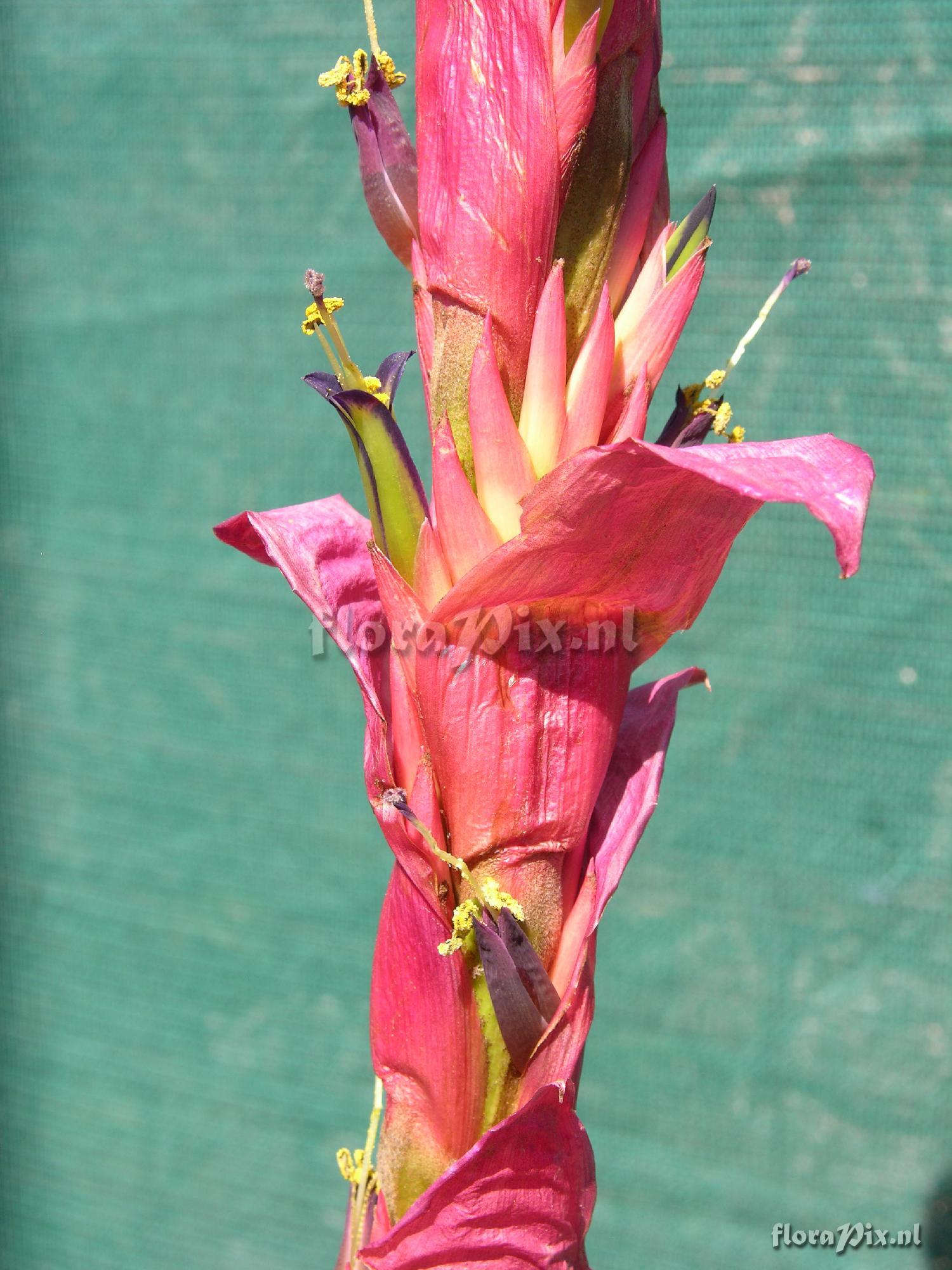 Locality: Loja - Ecuador - Yangana, South of Loja Photographer: Len Colgan Note: Those who were at Albury nearly four months ago might recall a plant with a forming tall red spike that I had collected in Ecuador. It is a TV, being previously known as Vriesea cylindrica, but now T. porphyrocraspeda. It was the most southerly plant I collected (during the second trip to Ecuador), with its habitat between Loja and the Peruvian border. I promised I would show images when it eventually flowered. Well, at long last it has! Please see the three attached images. For those who were not at Albury, the leaves are grey lepidote and firmish (actually much greyer than they appear in the first image). Notice how the bracts wither before the flowers emerge, as is the case with many species in this group. There will clearly be a lot of flowers. (Sent: brom-l@science.uu.nl)