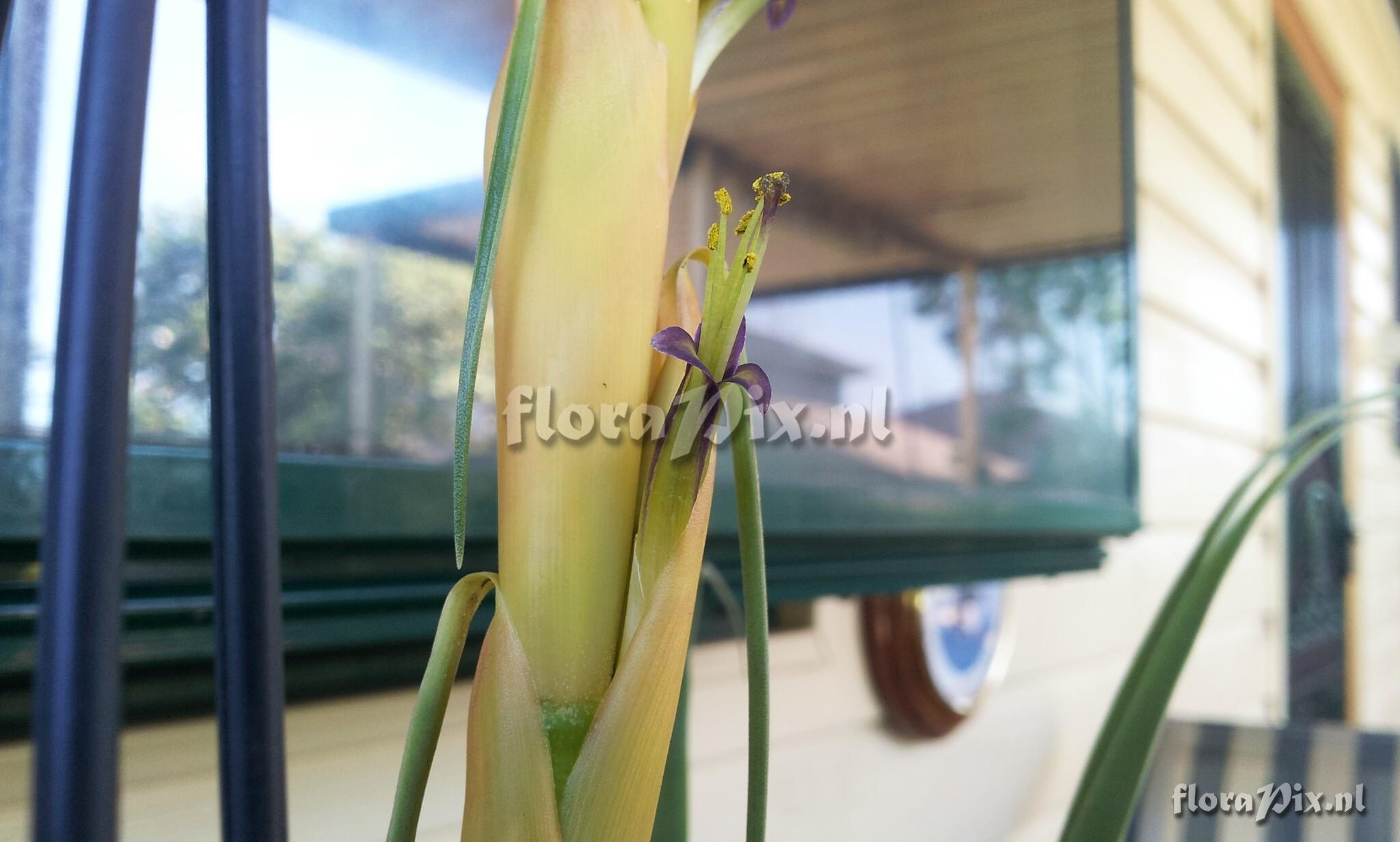 - Add Note (11341): Jerry Raack (2014-02-12) - Nice job posting the piece parts Peter. Who has done some study on this group of similar plants, does anyone know? When I compare pictures of this plant with what I posted and Eric identified as Tillandsia olmosana var pachamamae (Originally posted as Vriesia cylindrica), I'm hard pressed to see any significant differences other than color. Admittedly, I did not pull my inflorescence apart, but the closeup photos of the inflorescence and flowers sure look the same. I have another of my plants coming into bloom in a week or two, I'll pull it apart and do as you did with yours for comparison. Do you have some overall dimensions of your yellow form that you can post here (total height, width, length and width of leaves)? Does anyone in the USA have this plant and would like to trade me one for one of my T/V that I posted?