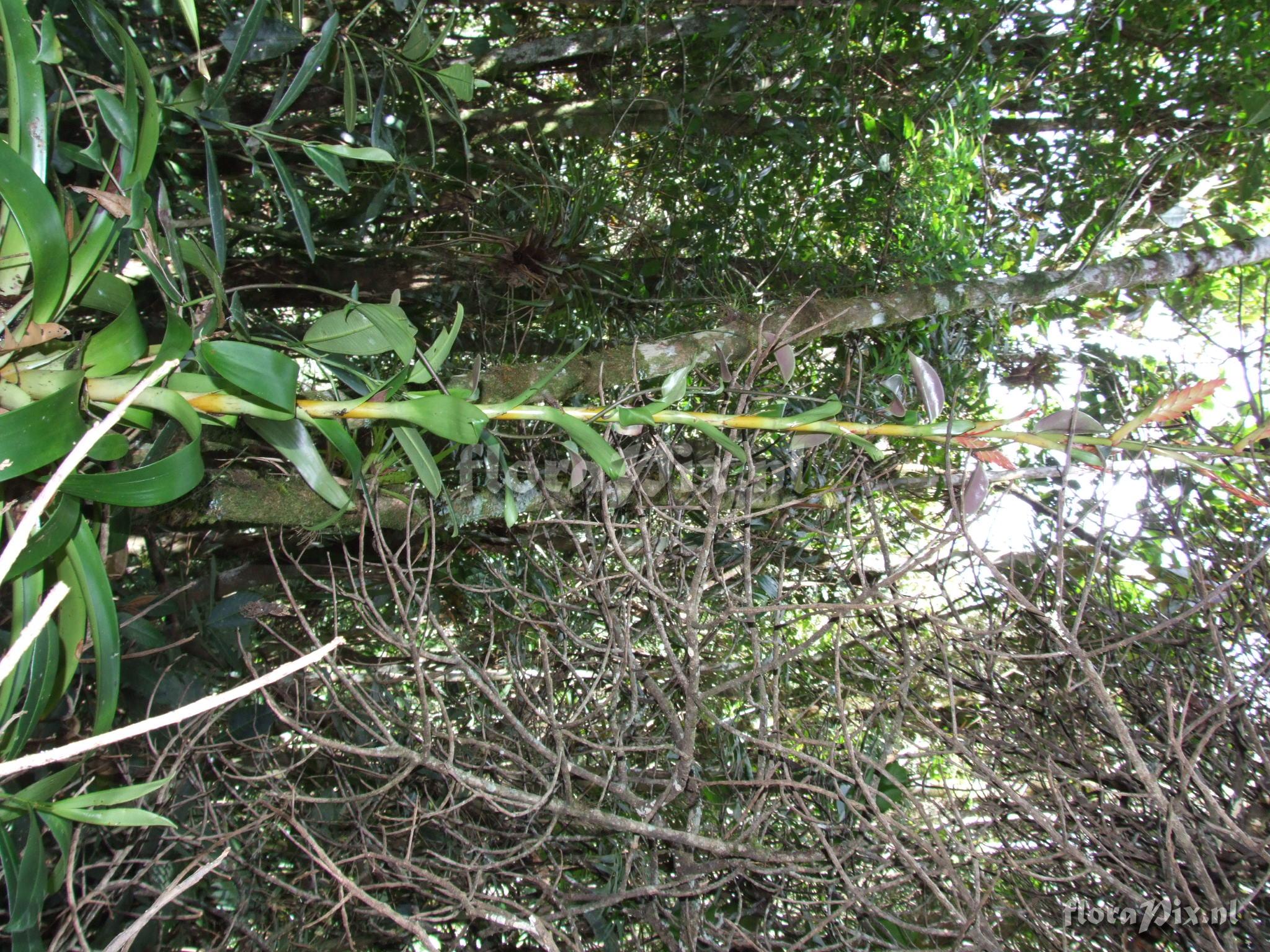 Locality: Ecuador - Prov. of Zamora-Chinchipe, area of Estación Cientifica San Francisco (S 03°58´, W 79°04´ ), road Loja-Zamora, ca. 35 km from Loja; moist montane forest Photographer: Florian Werner Note: Col.: Werner, F.A. 2043 (15-06-2006) got you! Several other infertile specimens around, infl. cf. co-occurring T. fendleri. Vegetatively Guzmania-like yet unmistakable with blunt, bright green, ribbonlike soft and u-shaped leaves that heavily bent downward right after the tank-base narrows. Infl. 1.5 m tall, with long leafy bracts along lower 2/3, flower bracts pinkish, petals light purple.