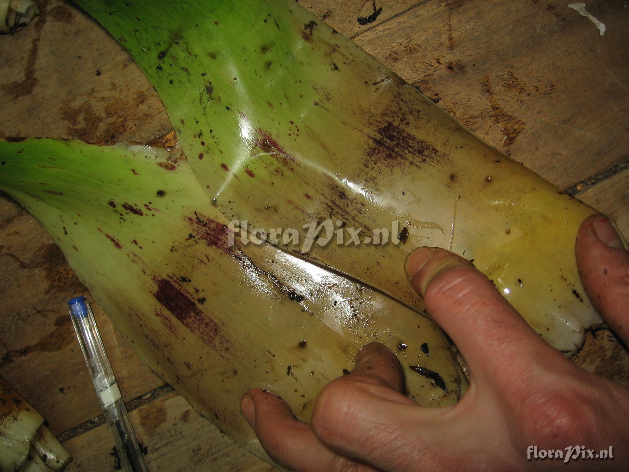 Locality: Ecuador - Prov. of Zamora-Chinchipe, area of Estación Cientifica San Francisco (S 03°58´, W 79°04´ ), road Loja-Zamora, ca. 35 km from Loja; moist montane forest Photographer: Florian Werner Note: Col.: Werner, F.A. 2043 (15-06-2006) got you! Several other infertile specimens around, infl. cf. co-occurring T. fendleri. Vegetatively Guzmania-like yet unmistakable with blunt, bright green, ribbonlike soft and u-shaped leaves that heavily bent downward right after the tank-base narrows. Infl. 1.5 m tall, with long leafy bracts along lower 2/3, flower bracts pinkish, petals light purple.
