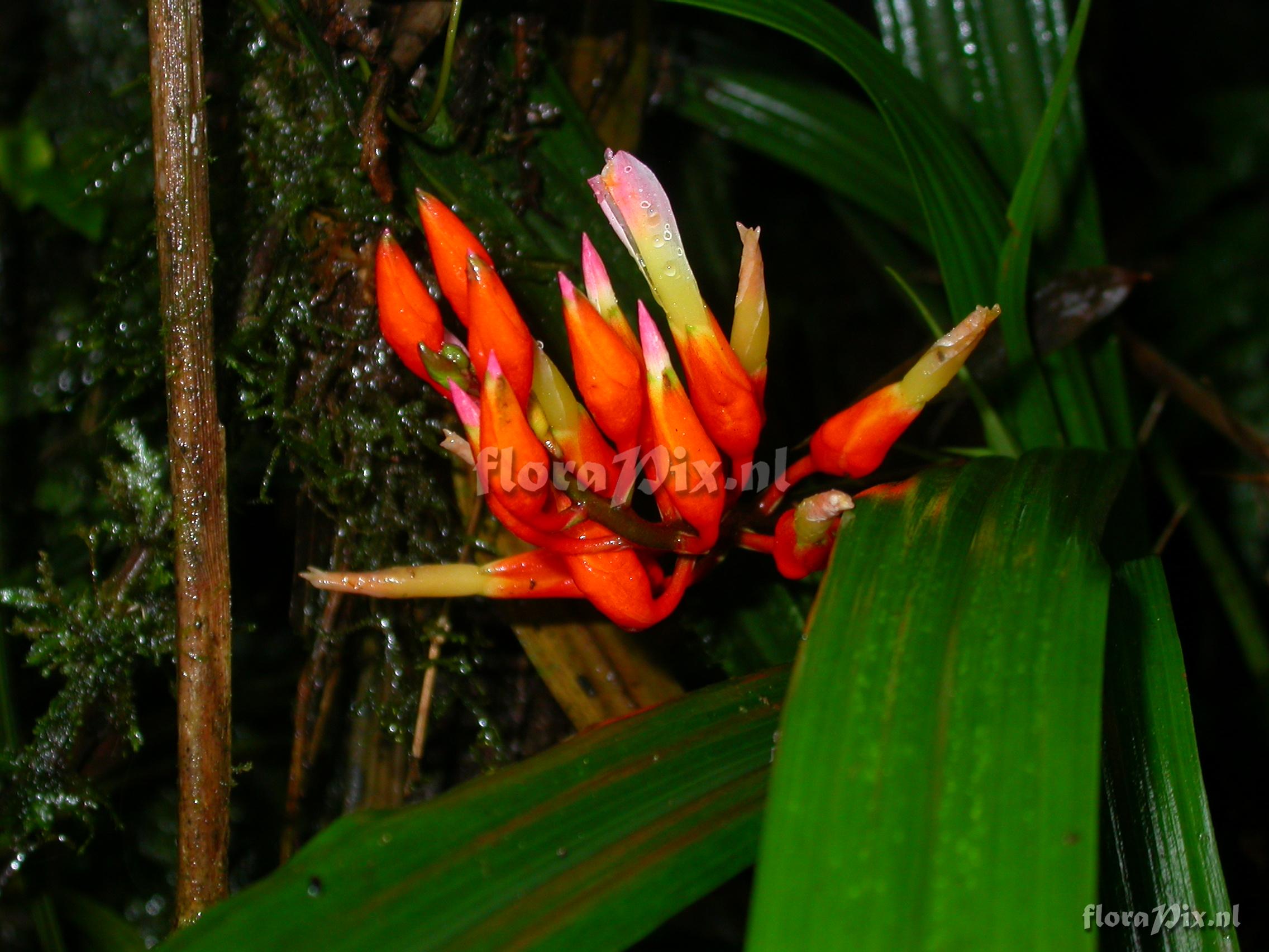 7881 - Bromeliads (Wild) - 2011-10-13(Dimension: 2302 x 1754 pixels - Counter: 12995) Pitcairnia cf. hiertzii ![]() Locality: Ecuador - Prov. of Zamora-Chinchipe, area of Estación Cientifica San Francisco (S 03°58“, W 79°04“ ), road Loja-Zamora, ca. 35 km from Loja; moist montane forest Photographer: Florian Werner Note: Col.: Werner, F.A. 3064 (25-04-2010) - Det.: W. Till (U Vienna) 2011 "plant totally free of spines; shoot erect and ca. 1 cm in diam; infl. bright brick-red but corolla orange."
